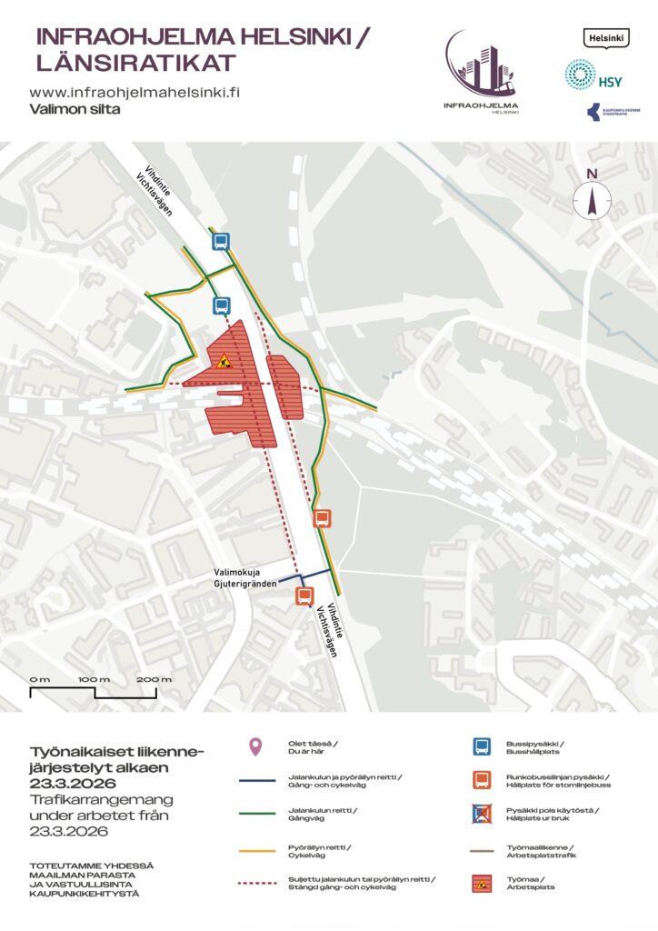 Vihdintien ylikulkusiltojen alittava jalankulun ja pyöräilyn väylä suljetaan maanantaista 23.3. alkaen. Kyseisellä jalankulun ja pyöräilyn väylällä aloitetaan kaapeleiden siirtotyöt, minkä vuoksi joudumme katkaisemaan sillan alittavan yhteyden jalankulkijoiden ja pyöräilijöiden turvallisuuden varmistamiseksi. Jalankulun ja pyöräilyn väylän kohdalle rakennetaan myös siltatöihin tarvittavia telineitä.